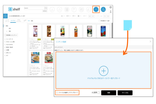 または登録エリア下部にある[ファイルを選択してアップロード]より、コンテンツを選択することも可能です。