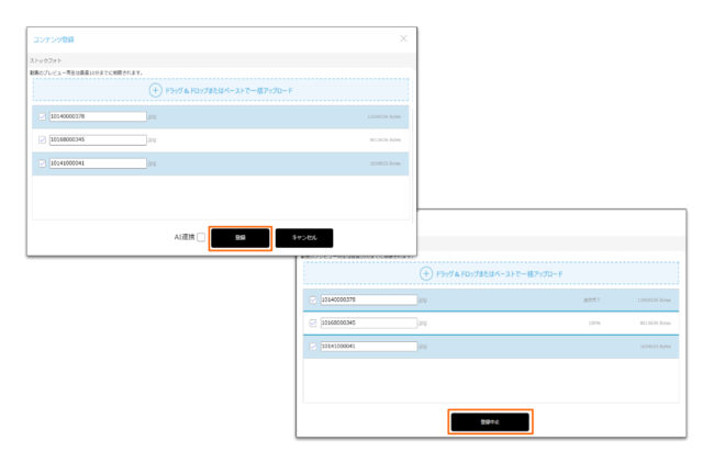 コンテンツごとにプログレスバーと%にて進捗状況が表示されますが、途中で[登録中止]をクリックした場合、転送が100%完了しているコンテンツのみサイトに登録されます。