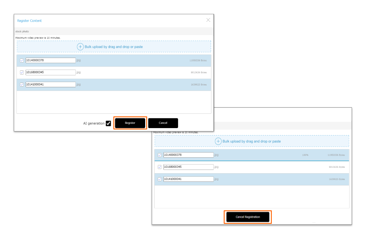 - コンテンツごとにプログレスバーと%にて進捗状況が表示されますが、途中で[登録中止]をクリックした場合、転送が100%完了しているコンテンツのみサイトに登録されます。