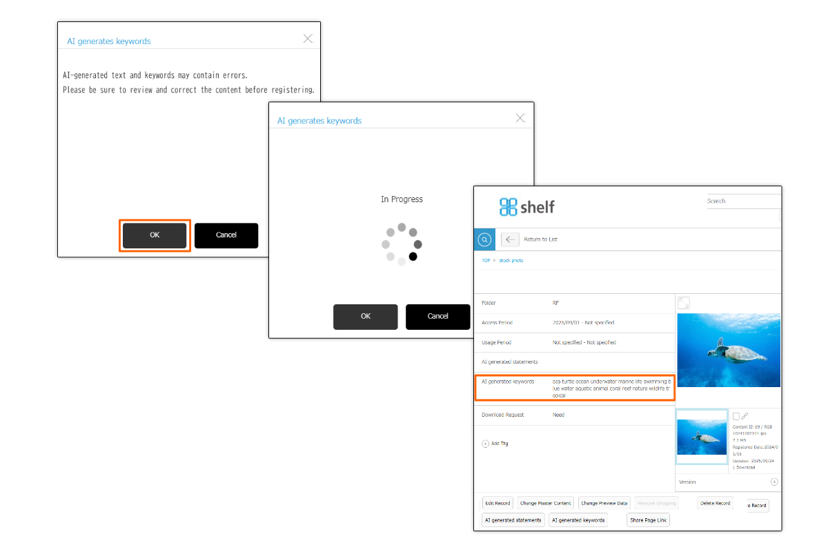コンテンツの新規登録時、および登録後に、AIによる文章・キーワードの生成機能をご利用いただけます。