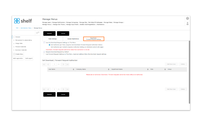 - Select the menu from which you want to remove an authorizer, then click the Download / Forward Reqeust Settings tab.