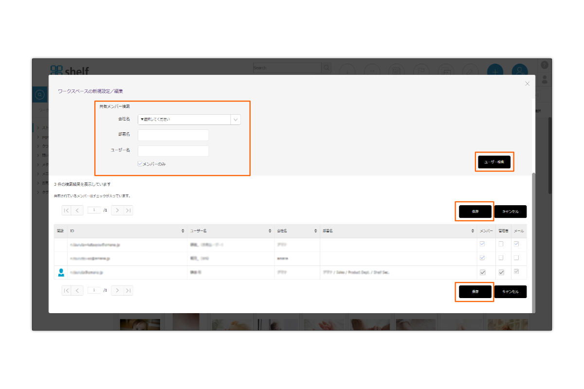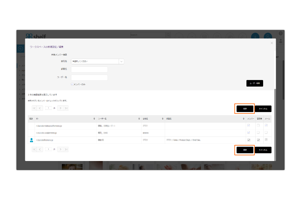 *ワークスペースのメンバーはあらかじめshelfに登録され、かつワークスペース利用が許可されたユーザーの中から選択できます。 追加したいユーザーが表示されない場合は、ユーザー管理>ユーザー詳細 の項目[ライブラリ・ワークスペース]の設定をご確認ください。